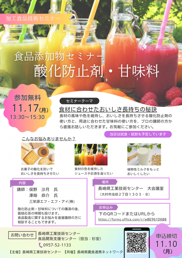 食品・食品添加物メーカーである三栄源エフ・エフ・アイから講師をお呼びして、食品添加物である「酸化防止剤」と「甘味料」についてご講演いただきます。食材の色や風味を活かす・魅せる酸化防止剤の使い方や、用途に合わせた甘味料の使い方について学び、加工食品の製造・改良のヒントを得ることを目的としています。ぜひご参加ください。