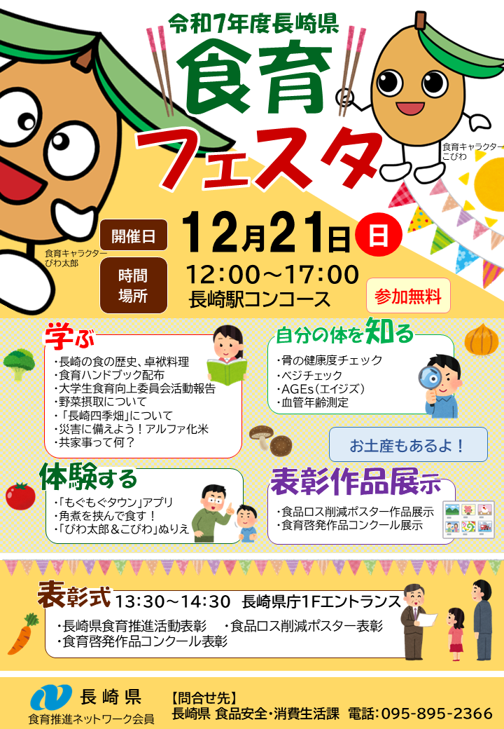 長崎県では、「食」に関する正しい知識の習得や、農林水産業に対する理解を通じて、自ら「食」について考え、健全で安心な食生活を身につける「食育」について、家庭、学校、地域などでの自主的、自立的な活動を推進しています。