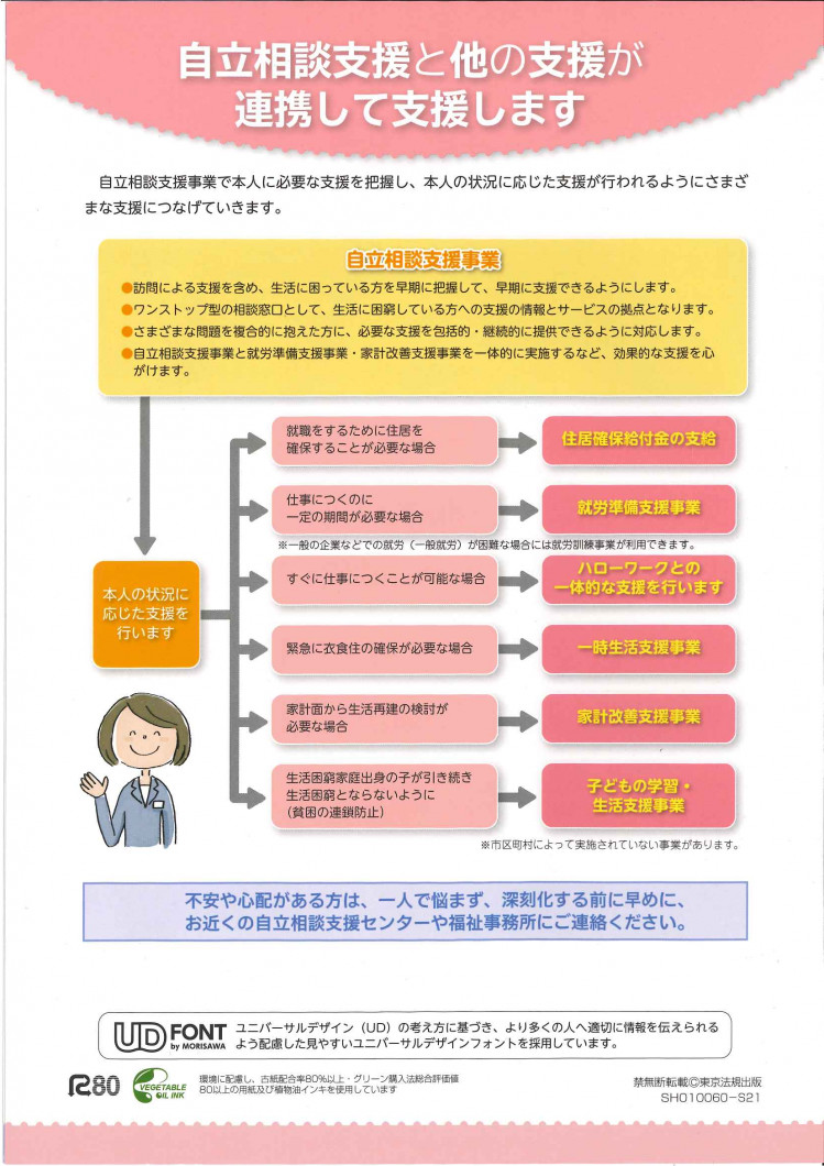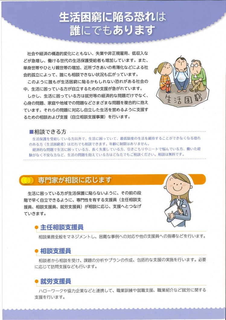 経済的に困窮し、最低限度の生活を維持することができなくなるおそれのある方に対して、個々の状況に応じた支援を行い、自立の促進を図ることを目的としています。