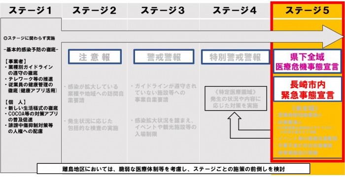 • 長崎市の感染拡大の影響を受け、県全体においても県ステージ5の状況。