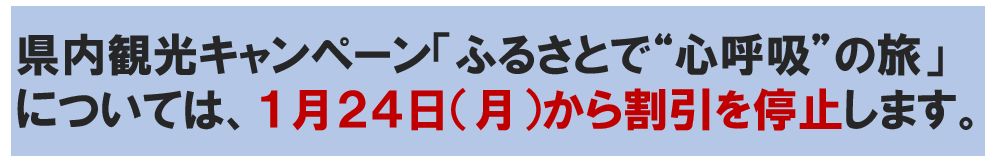 県内観光キャンペーン「ふるさとで“心呼吸”の旅」については、令和4年1月24日(月曜日)から割引を停止します。