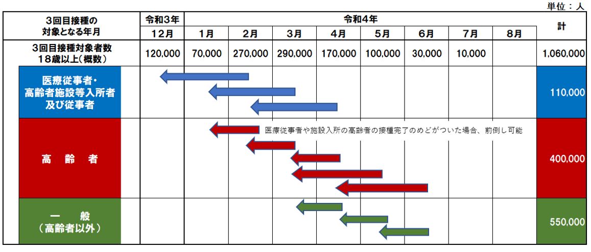 - 6カ月(2カ月前倒し)… 医療従事者等、高齢者施設等の入所者・従事者、一般高齢者(3月以降6カ月経過)