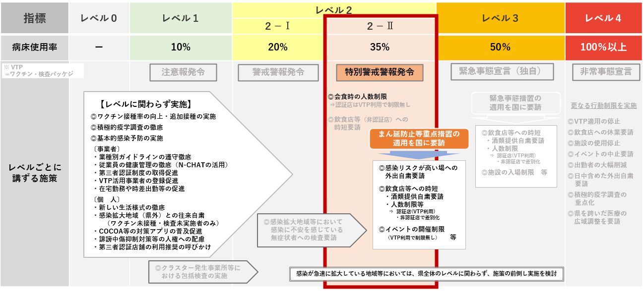 新規感染者の爆発的な増加により、病床使用率が近日中に基準に到達すると予測されるため、県内の感染段階を【レベル2-Ⅱ】 に引き上げ、