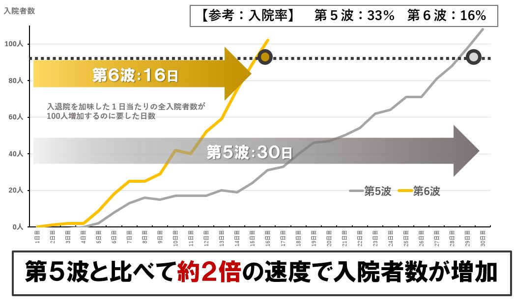 第6波は第5波と比較して入院率はやや低いものの、感染者数の急速な増加に伴い、入院者数は約2倍のスピードで拡大しており、今後病床の逼迫が懸念される