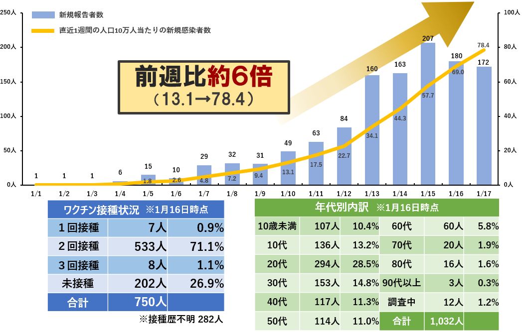 ※前週比で新規感染者(10万人/週)が約6倍(13.1人 ⇒ 78.4人) -