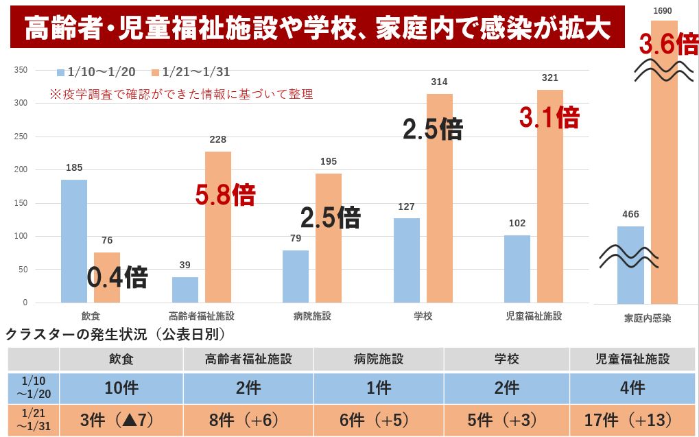 - 高齢者・児童福祉施設や学校、家庭内で感染が拡大