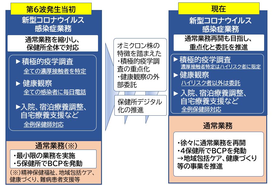 「オミクロン株の特徴を踏まえた対応」と「保健所デジタル化」をさらに推進し、新型コロナ業務と通常業務の両立を図る。