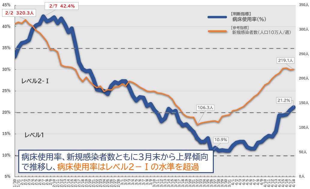 病床使用率、新規感染者数ともに3月末から上昇傾向で推移し、病床使用率はレベル2-Ⅰの水準を超過