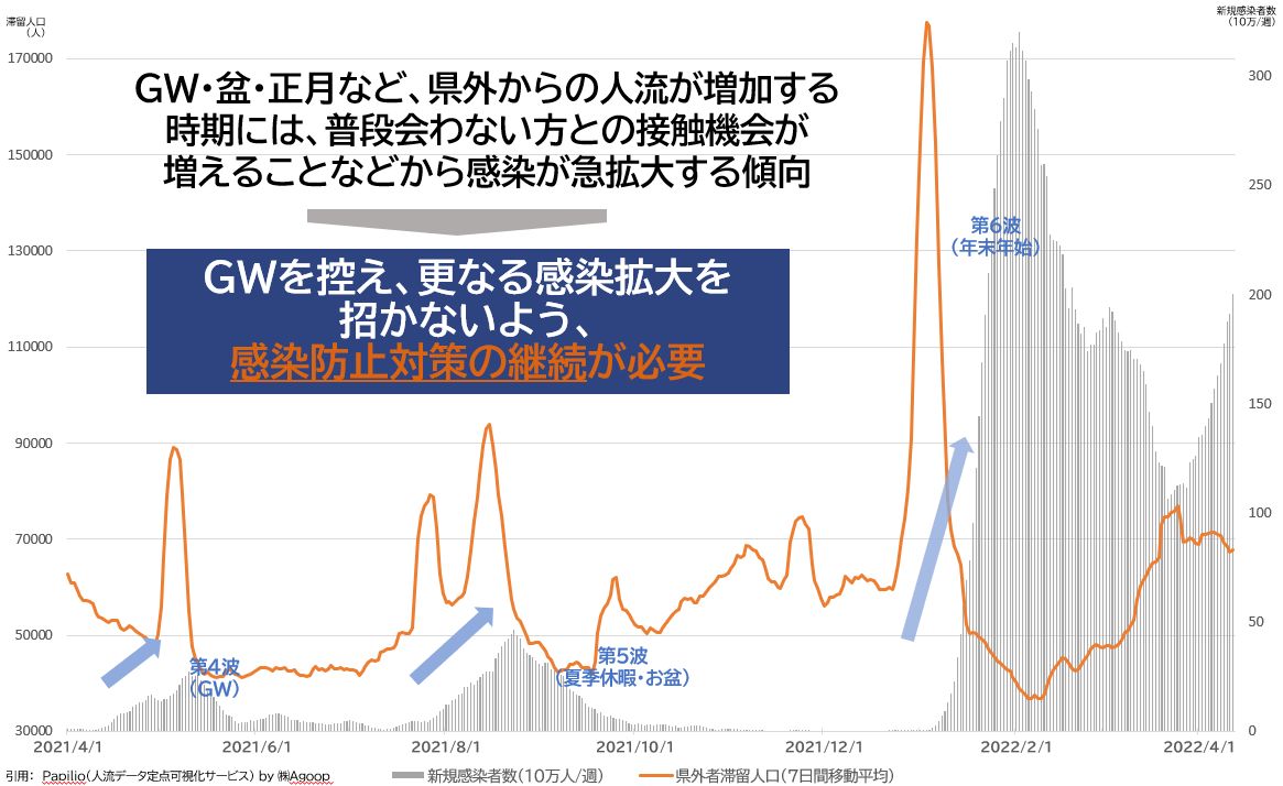 - GW期間中は、帰省等で重症化リスクの高い高齢者や基礎疾患をお持ちの方と接触する機会が増える時期となります
