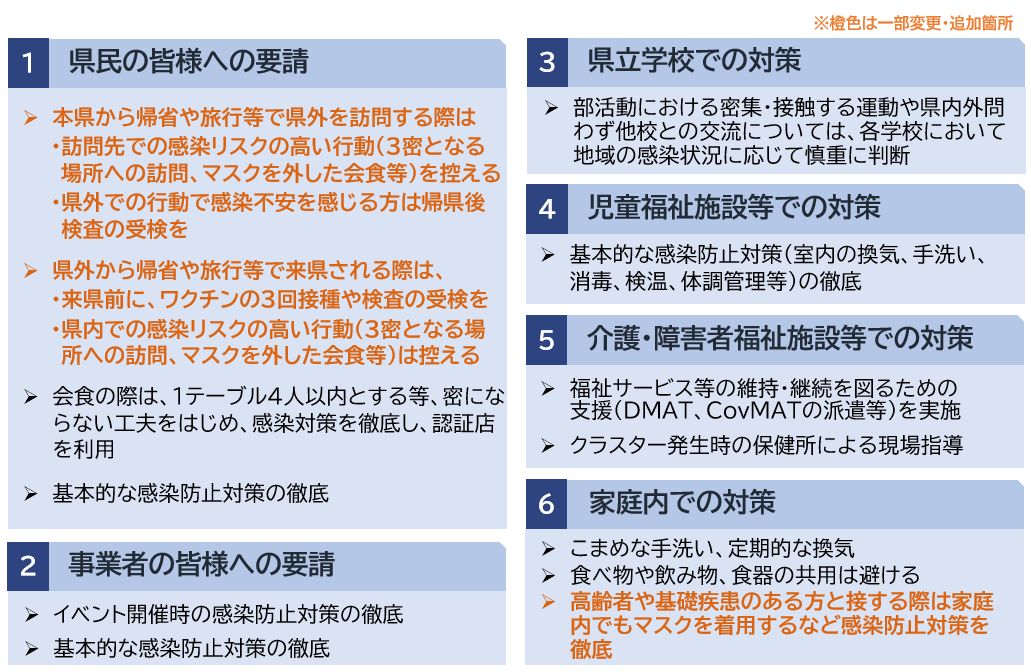 - 引き続き、県民の皆様に対し、積極的なワクチン接種、会話時のマスク着用や三密の回避などの基本的な感染防止対策の徹底を呼び掛けてまいります。