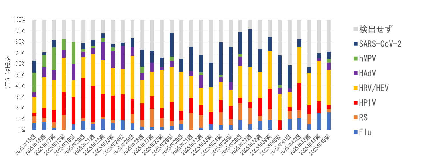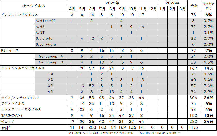 - 2025年11月に搬入された検体について遺伝子検出を行ったところ、ライノ/エンテロウイルス(36%)が多く検出されました。