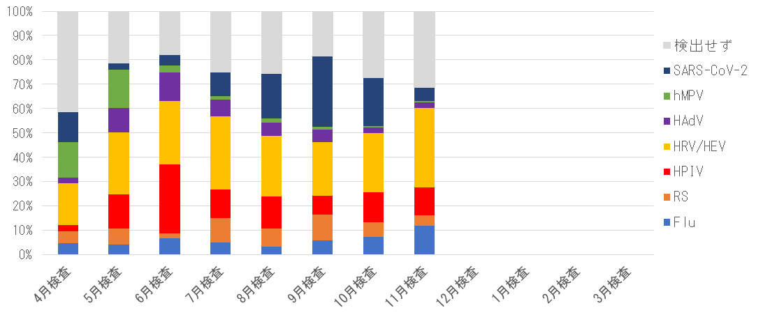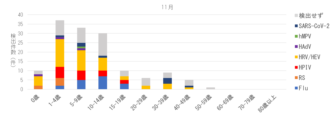 - 11月に搬入された検体において、ライノ/エンテロウイルスが幅広い年代で検出されました。