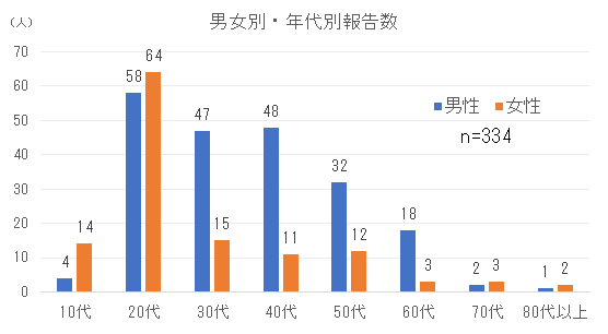 - 2023年第1週から2025年第47週までの334人の報告のうち、性別では男性が多く、年代別では20代が約4割を占めています。