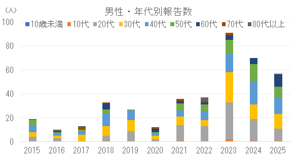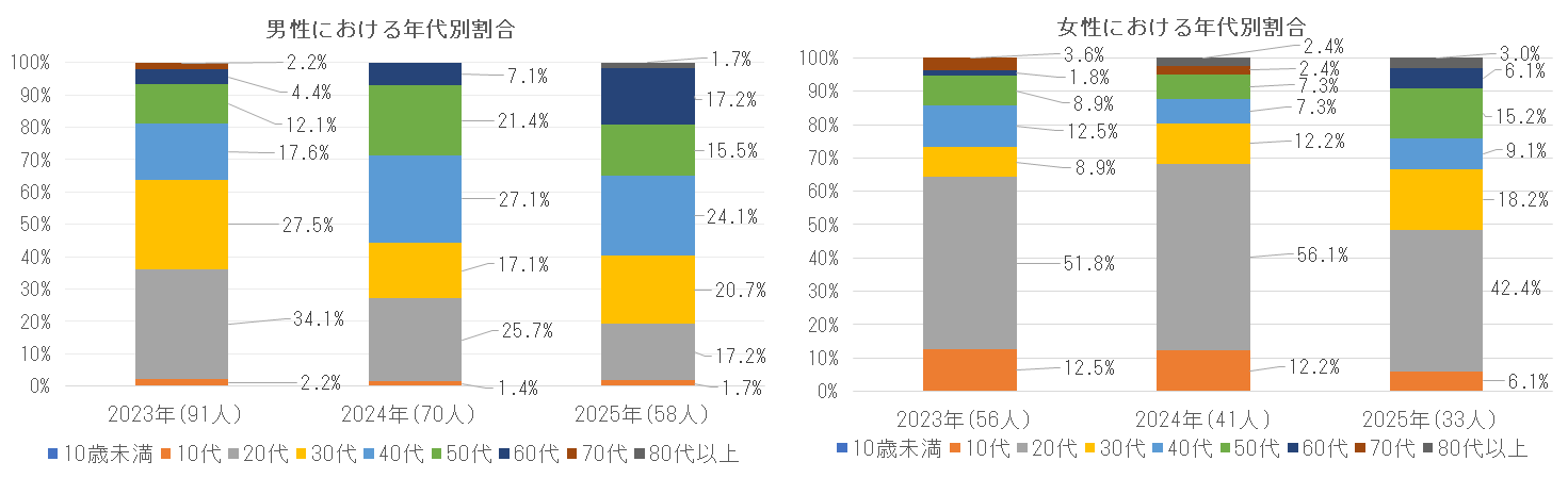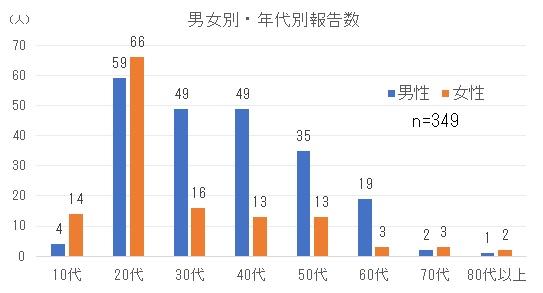 - 男性では20代から50代が多く、女性では20代が多くなっています。