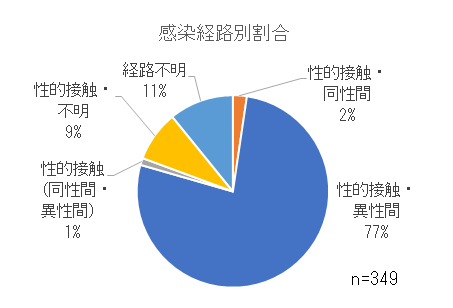 - 2023年第1週から2025年第51週までの349人の報告のうち、性別では男性が多く、年代別では20代が約4割を占めています。