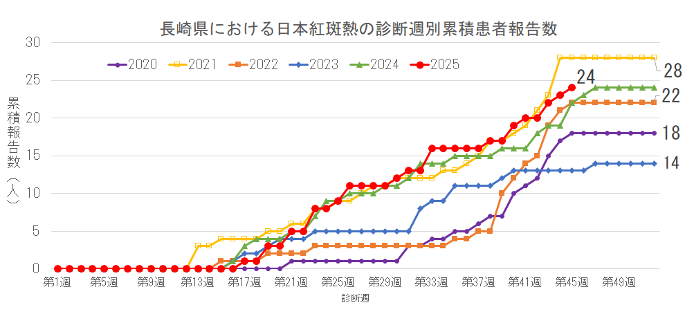 2025年は、長崎県は第45週、全国は第44週までの報告数を掲載しています。