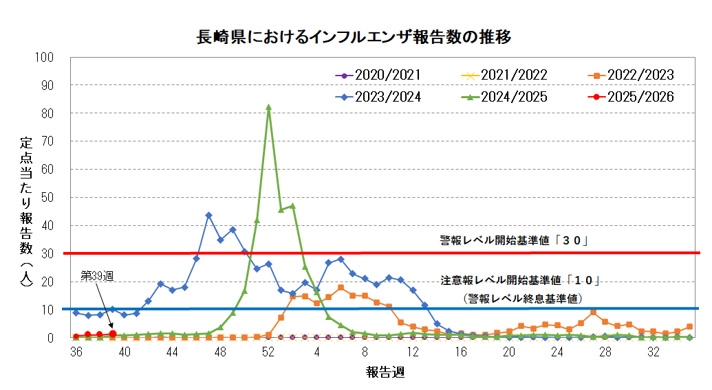 長崎県の第39週の患者報告数は77人で、定点当たり報告数は「1.51」でした。県全体では、第37週に流行の目安である「1.0」を超え、流行期入りしています。