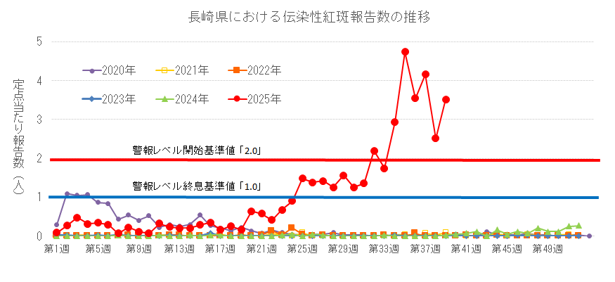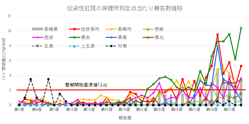 2025年第39週の報告数は109人で定点当たり報告数は3.52でした。第32週に警報レベル開始基準値「2.0」を超え、8週続けて警報レベルの報告数となっています。地区別では、10保健所中5保健所において、警報レベルの報告数となっています。