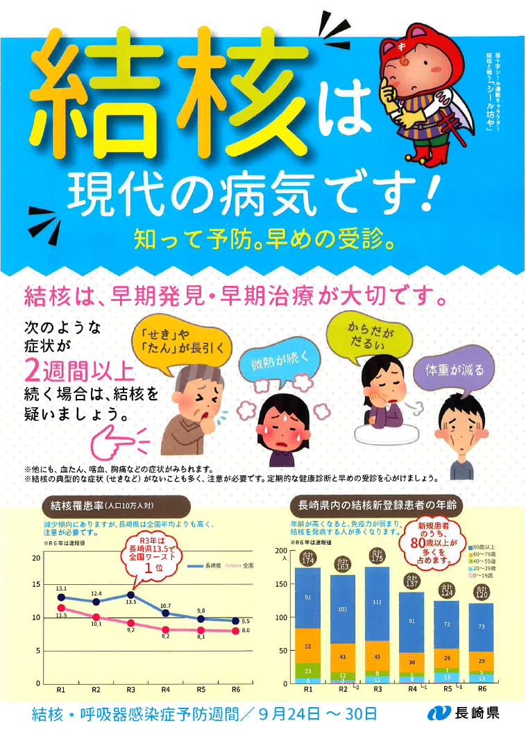 厚生労働省は毎年9月24日から9月30日を結核・呼吸器感染症予防週間と定めており、結核と呼吸器感染症に関する正しい知識の普及啓発を図ることとしています。