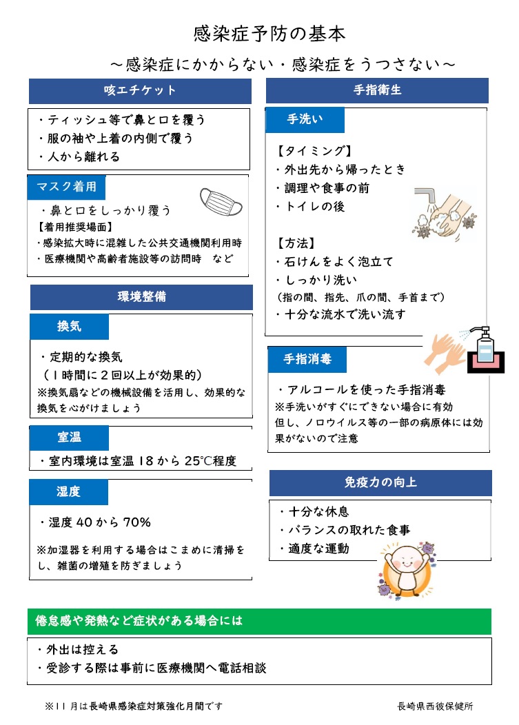 感染症予防である手指衛生、換気、咳エチケット、免疫力を高める(十分な休息、バランスの取れた食事、適度な運動、ワクチン接種等)など対策をとりましょう。
