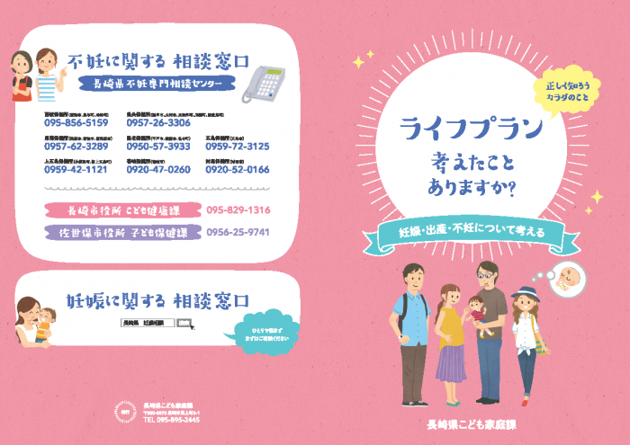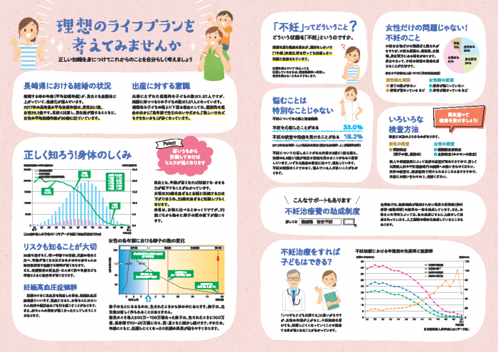 そこで、長崎県では、妊娠・出産・不妊についての正しい知識をまとめたリーフレット『ライフプラン考えたことありますか?~妊娠・出産・不妊について考える~』を作成しました。