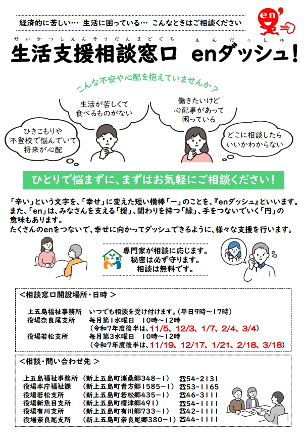 生活に困りごとや不安を抱えている場合は、まずは上五島福祉事務所にご相談ください。支援員が相談を受けて、どのような支援が必要かを相談者と一緒に考え、具体的な支援プランを作成し、寄り添いながら自立に向けた支援を行います。