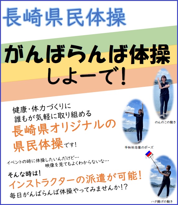 がんばらんば体操ポスター本県出身の歌手さだまさしさんが、長崎弁で歌って注目を集めたヒット曲「がんばらんば」。長崎弁で「頑張らないと」という意味のこの曲は、歌詞に長崎弁がふんだんに使われているほか、長崎地方のわらべうたも盛り込まれた郷土色豊かな曲です。県では、この曲を使って、県民の健康・体力づくりと平成26年に開催した長崎がんばらんば国体及び長崎がんばらんば大会の機運醸成を目的として、誰もが気軽に取り組める長崎県オリジナルの楽しい県民体操として、平成19年度に創作しました。