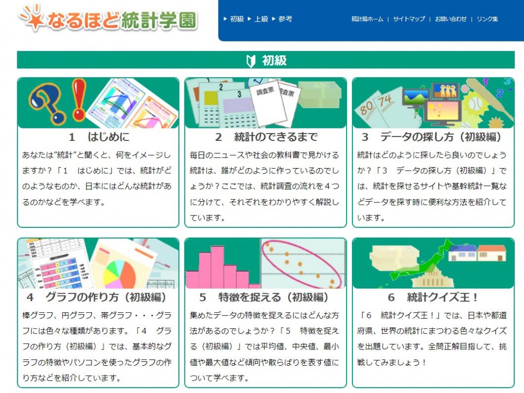 総務省統計局の「なるほど統計学園」では、統計についてやグラフの作り方をわかりやすく紹介しているよ!