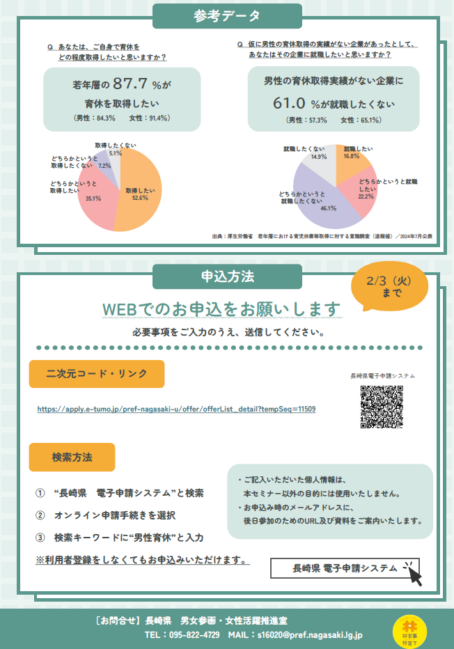 県では、長崎労働局と共催で、男性の育児休業取得促進・周知のために講師を招き、県内企業向けのセミナーを開催いたします。