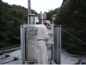 長崎県では、環境省から委託を受けて対馬市に雨水を自動的に採取する機械を設置しています。採取した雨水のpH測定や雨水に含まれる硫酸イオンや硝酸イオン濃度等の分析を行い、当県の酸性雨の降雨状況を調査しています。