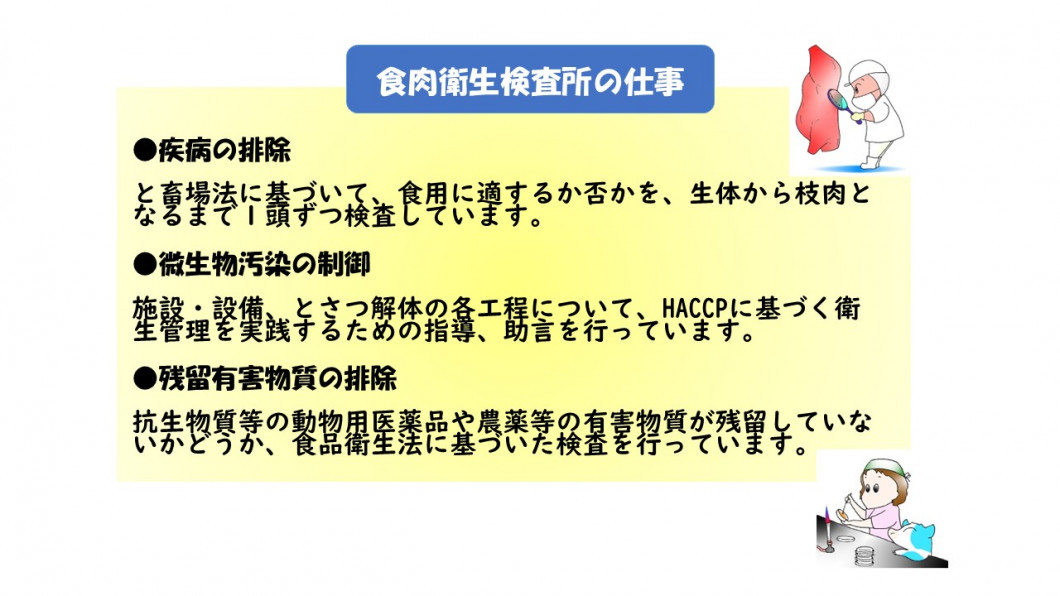 食肉衛生検査所では、安全で衛生的な食肉が流通し、消費者の皆さんに安心して食べていただけるよう、この法律に基づいて、獣医師である職員が検査や衛生指導など様々な業務を行っています。