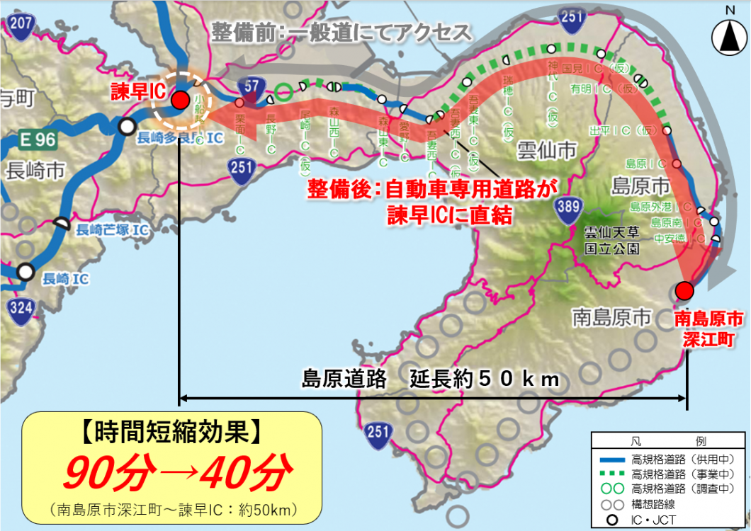 島原道路の整備により、諫早市中心部と島原半島との時間短縮を図り、沿線地域の地域活性化や救急医療の強化を目的としています。