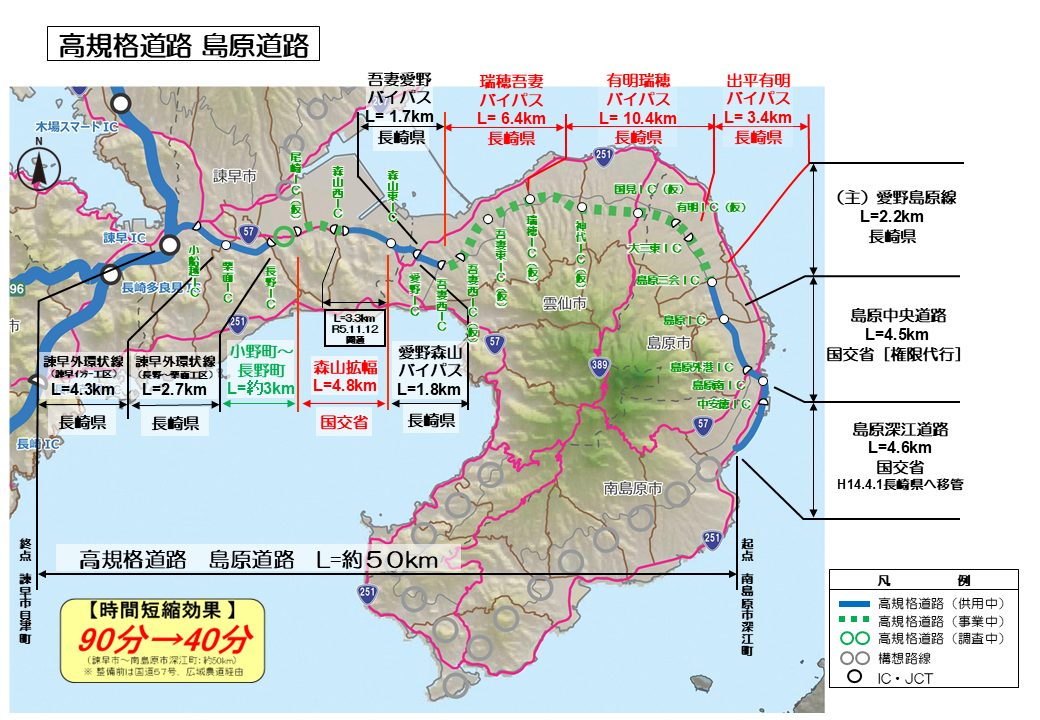 これまで、島原深江道路(約5km)、島原中央道路(約5km)、島原市下折橋町~島原市出平町(約2km)、吾妻愛野BP(約2km)、愛野森山BP(約2km)、森山拡幅(森山東IC~森山西IC:約3km)、諫早インター工区(約4km)と長野~栗面工区(約3km)の計8区間(約26km)が完成しています。