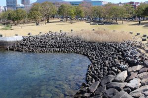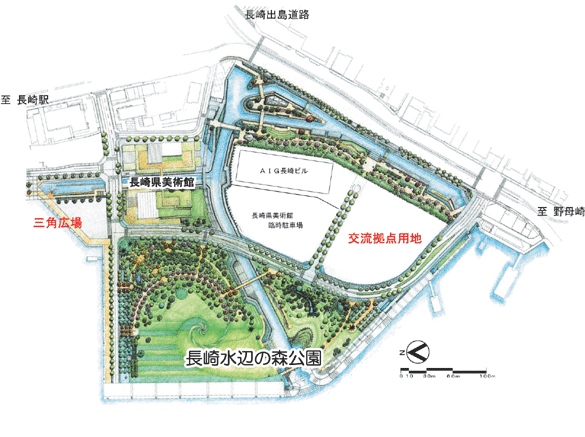 • 当地区は、人々が集い憩える長崎の新しい顔となる親水空間の整備等を進め、埋立によって生じた用地に、長崎の都心部に不足している緑地・広場等のオープンスペースを確保する目的で、「長崎水辺の森公園」を整備しました。