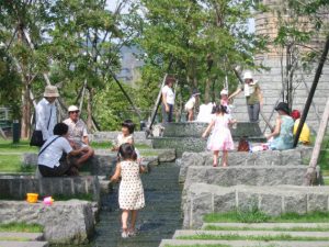 • このように、景観を重視して整備した「長崎水辺の森公園」は、平成16年度において、Gマークで有名なグッドデザイン賞の選定で高い評価を得、建築・環境部門の金賞を受賞しました。審査委員からは「子供から大人まで楽しめるように配慮された質の高い空間。また、年月の経過によって、水辺をそなえた豊かな森の公園となるように計画されており、時間までもがデザインされている」と高く評価されました。