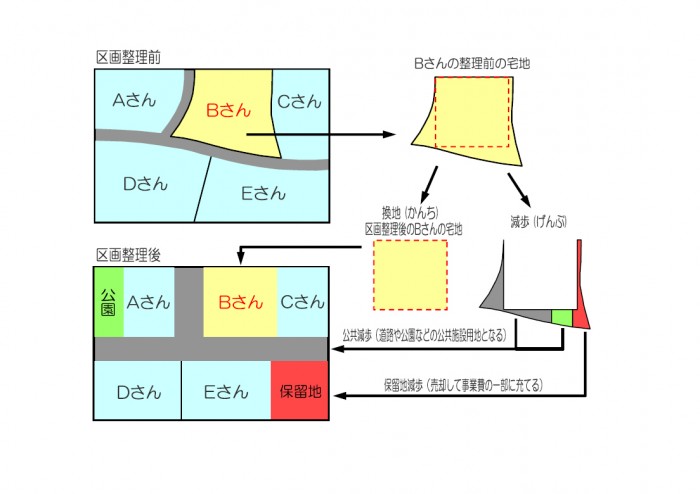 土地所有者の皆様においては、減歩により整理前と比べて宅地面積が減少する一方、