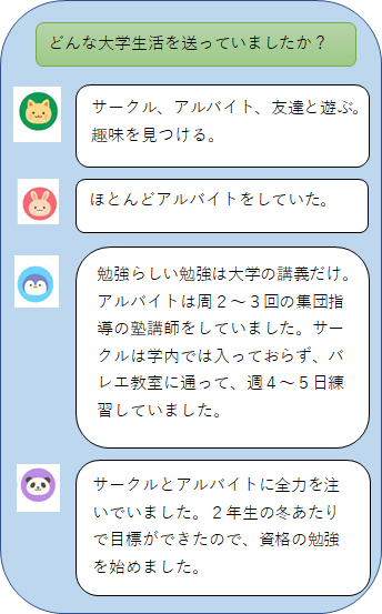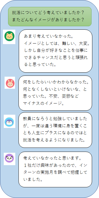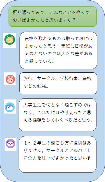 就活応援コラム第1回目は、キャリアコーディネーターと一緒に就活を進めた4年生に「1、2年生の頃は就活をどう考えていたか」を聞いてみました。