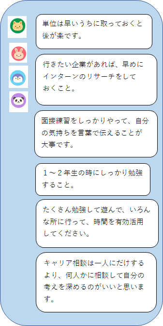 就活のことだけでなく、大学生活をどのように過ごすかなど、いろいろなことを考えるきっかけに