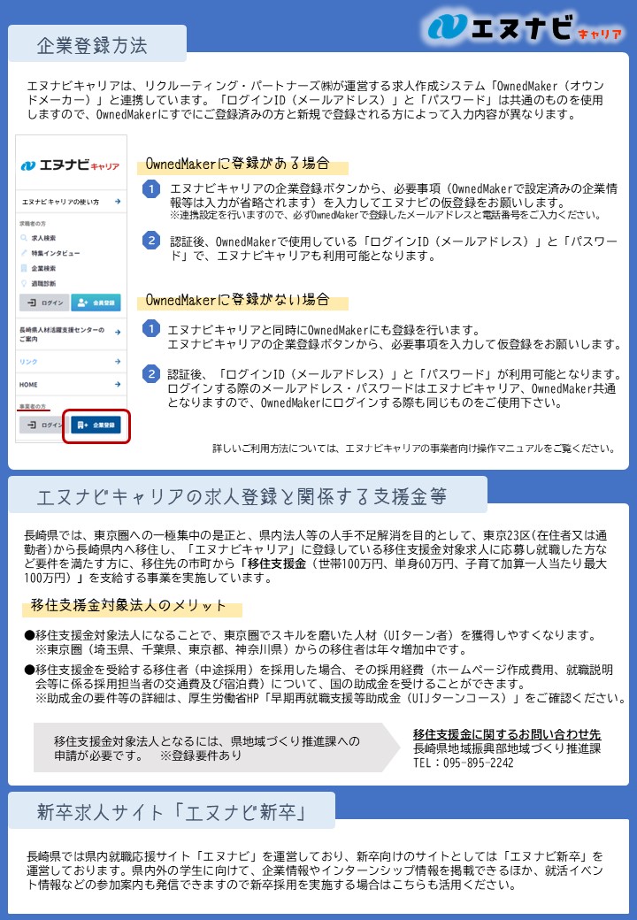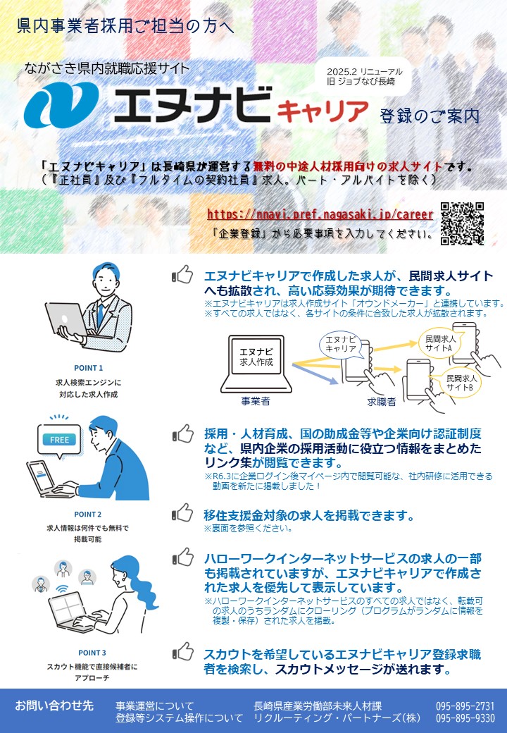 長崎県では、長崎県内への就職や移住・UIJターン就職の推進を目的とし、大学等新卒向け求人サイト「エヌナビ新卒」、既卒者・一般求職者向け求人サイト「エヌナビキャリア」を運営しています。