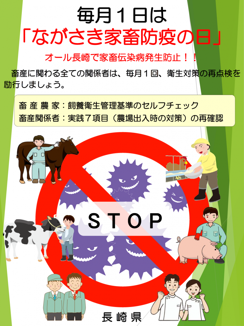 県では、家畜伝染病の発生を防止するため、家畜生産者のみならず畜産関係者も一丸となって防疫強化を図るための取り組みとして、毎月1日を「ながさき家畜防疫の日」として制定し、飼養衛生管理基準の徹底をはじめとした予防衛生対策に関する活動に取り組んでまいります。 生産者の皆様におかれましては、毎月1日にはチェック表によりセルフチェックを行っていただきますようよろしくお願いします。