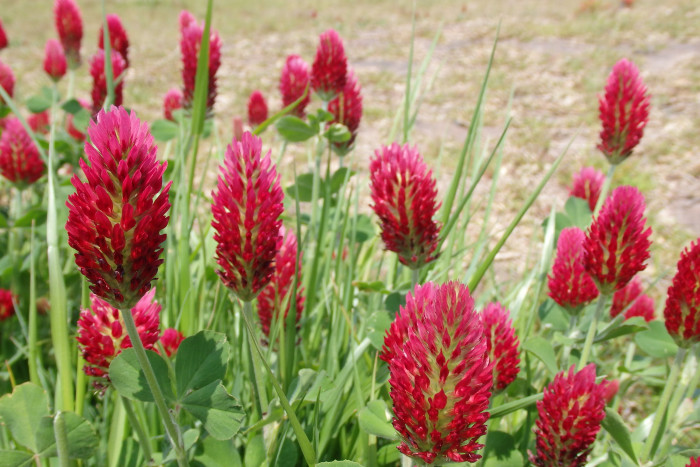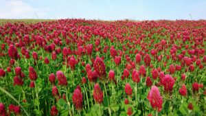 来訪される皆様に諫早湾干拓の雄大な景観を楽しんでいただくため、中央干拓地の内部堤防の内側斜面をクリムソンクローバーという赤い花でいっぱいにする取り組みを進めています。