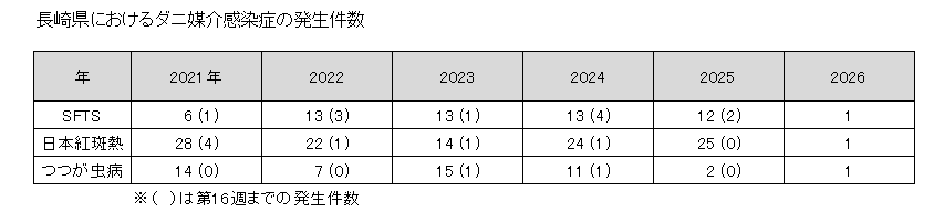 発生状況、感染対策について、長崎県感染症情報センターホームページ内「ダニ媒介感染症」にも掲載しています。