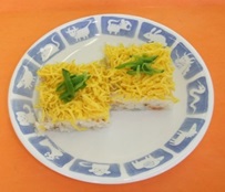 - 正方形に切り分け、きぬさやを飾る。