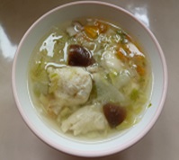平戸でとれる食材を使って作ります。だしには、あご(とびうお)を使い、しいたけ(ひらどロマン)、平戸でとれる白身魚やかまぼこ(スボかまぼこ)、旬の野菜が入っています。「ちゃんこ」とは、お相撲さんが食べる食事のことで、平戸の「最教寺」では、毎年「子泣き相撲」が行われています。