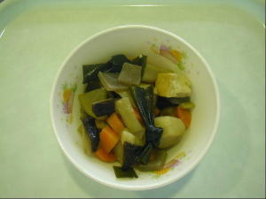 おつぼは、福江で昔から食べられてきた精進料理のひとつです。地域によっては、味つけや材料の切り方が少しずつ違います。本来は、花形の大きめのふを別に炊いて、盛りつけの最後に上にのせます。