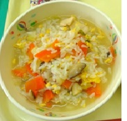食べ物が不足していた時期に、かぼちゃなどの野菜を入れた雑炊でお腹を満たしていたそうです。給食では、もともとの「ぼうぶらずうし」(かぼちゃ入りの雑炊)をアレンジし、いろいろな具材を入れて作っています。