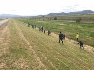 職員のかけ声で一斉にクリムソンクローバーの種をまいていきます。みなさん来年度の開花が待ち遠しい様子でした。