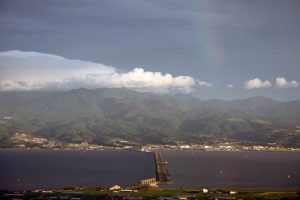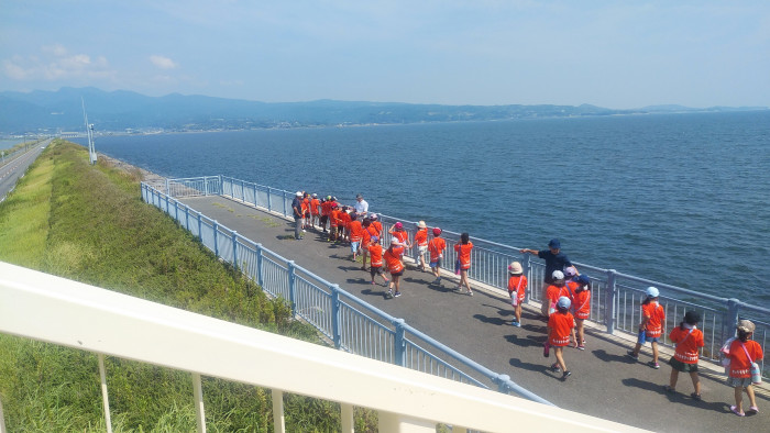 国営諫早湾干拓事業によって整備された潮受堤防。堤防上には、地域の交通アクセス改善を目的に、諫早市高来町と雲仙市吾妻町を結ぶ「雲仙多良シーライン」の愛称で親しまれる農道が整備されています。約7kmにもわたって続く直線の道!ほかではなかなか見ることができない光景です! 場所 写真 道路の中間地点には、有明海といさはや新池(調整池)を望める展望遊歩道橋などが整備されています。