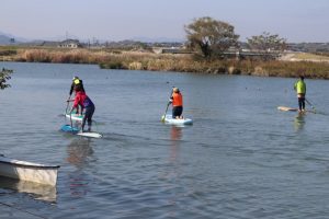 サーフボードより少し大きめの板の上に立ち、パドルを漕ぎながら移動する水上アクティビティです。体幹が鍛えれられ、エクササイズ効果があるため女性にも人気のスポーツです。