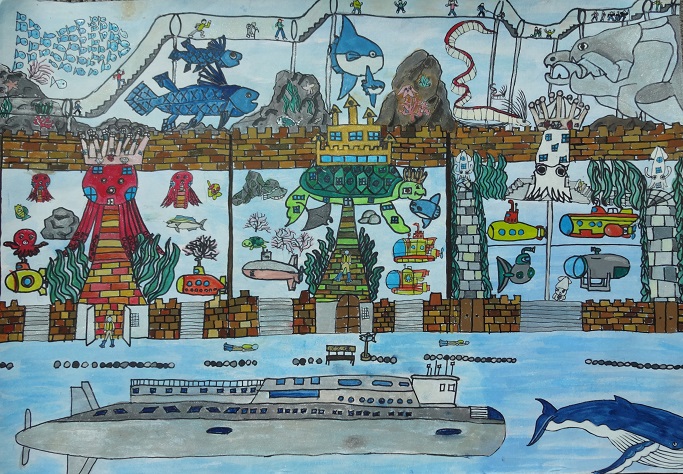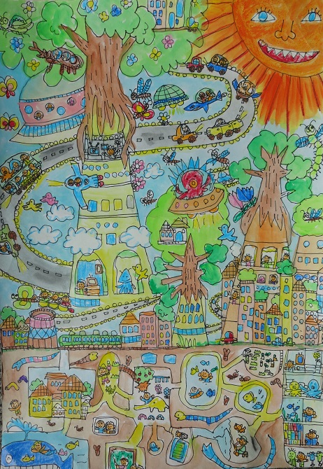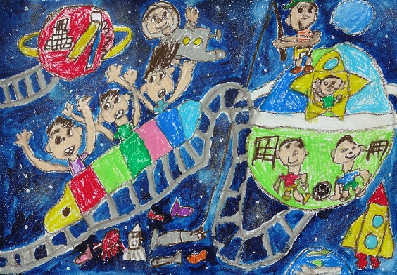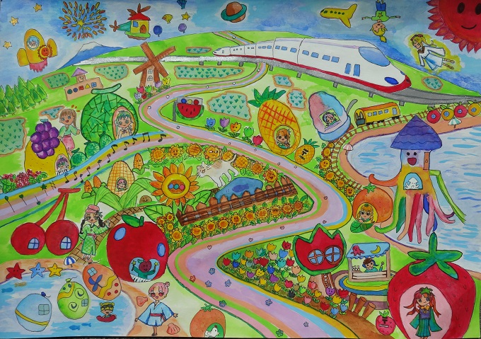 【審査員コメント】 ・今にも画面から飛び出してきそうなジェットコースターに、未来への強い憧れや願いを感じる。宇宙のまちで、釣りやサッカーなどを楽しむ人たちの表情もとても愛らしく、魅力を感じる作品。 ・宇宙空間をジェットコースターに乗って旅している様子が夢のある未来の世界を感じさせ、描かれた人々の表情がみんなにこやかで動きのあるのびのびとした作品。 ・ジェットコースターで公園に行くなどの発想も面白い。 ・宇宙と地球をジェットコースターで自由に往来できる街をきれいな色づかいで表現していてとてもよい。 |